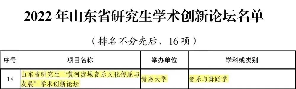 申报的《山东省研究生“黄河流域音乐文化传承与发展”学术创新论坛》获得2022年山东省研究生学术创新论坛立项。是山东省高校音乐与舞蹈学科范围内唯一获得该项目立项的学校。